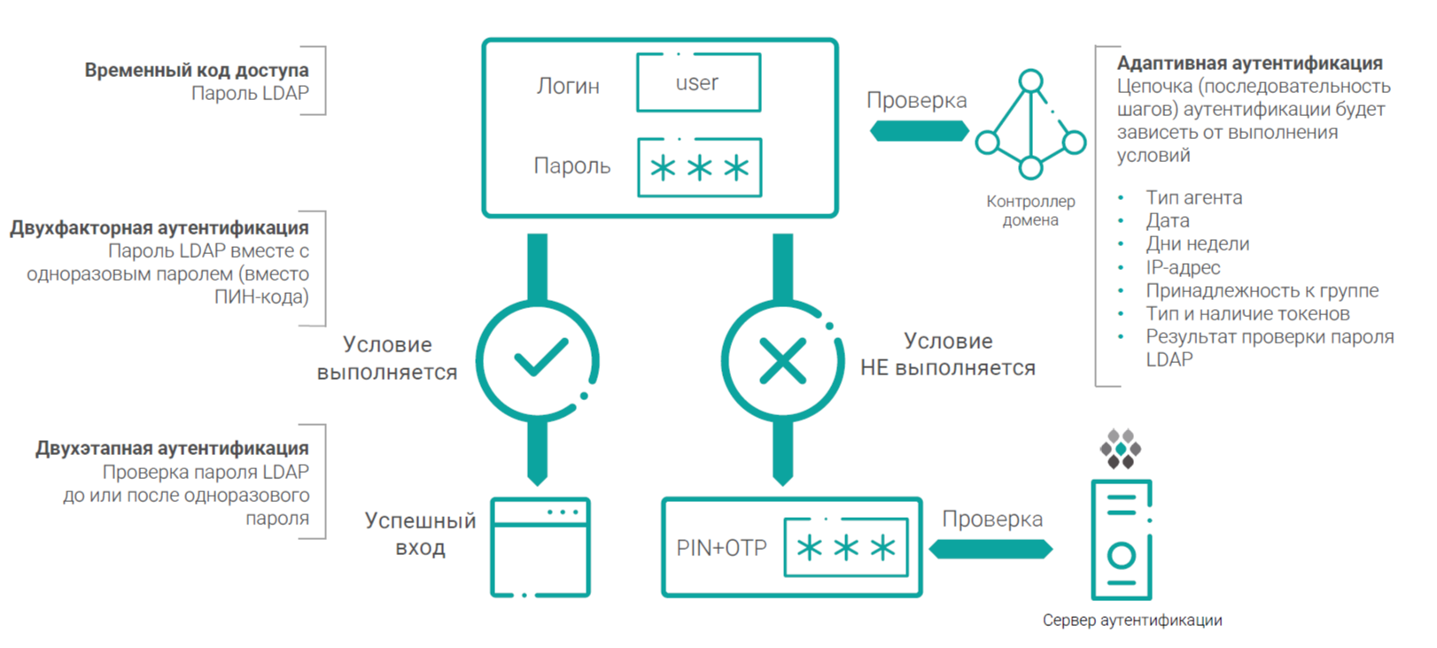 Например, если доступ к порталу самообслуживания извне контролируемого периметра должен быть защищён комбинацией LDAP-пароля и OTP, а изнутри сети — только LDAP-паролем, то можно создать соответствующее правило. По нему доступ к агенту «Портал самообслуживания» извне должен требовать от пользователя ввода логина, LDAP-пароля и OTP, а доступ к агенту изнутри — только логина и LDAP-пароля.