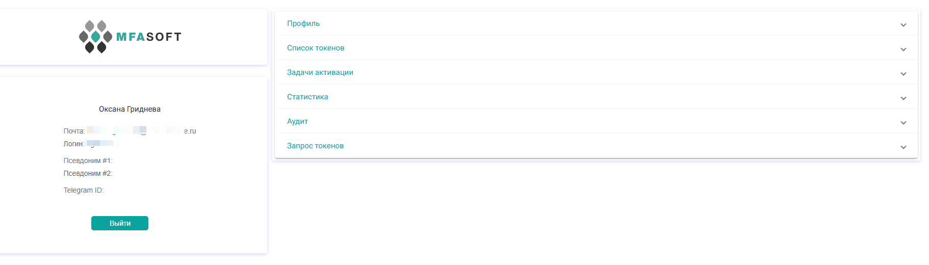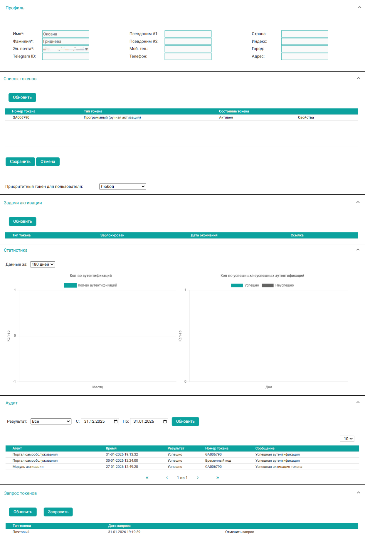 Портал самообслуживания позволяет пользователю завершать активацию токенов через ссылку, запрашивать новые токены с определением доступных типов и правил утверждения оператором, а также редактировать профиль, включая контактные данные и адрес для связи со службой поддержки.
