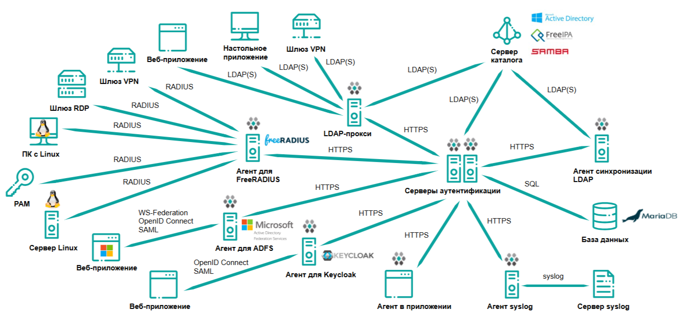 - Интеграция с корпоративными информационными системами через стандартные протоколы (Web API MFASOFT — для случаев, если приложение не поддерживает ни один из стандартных протоколов).