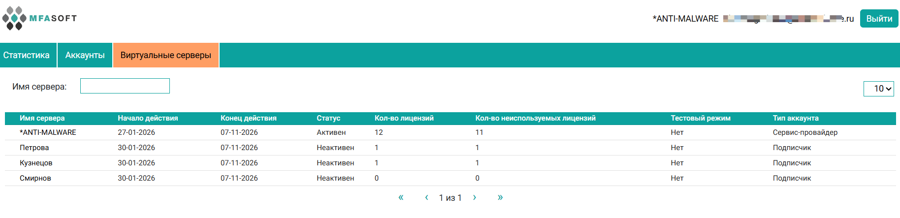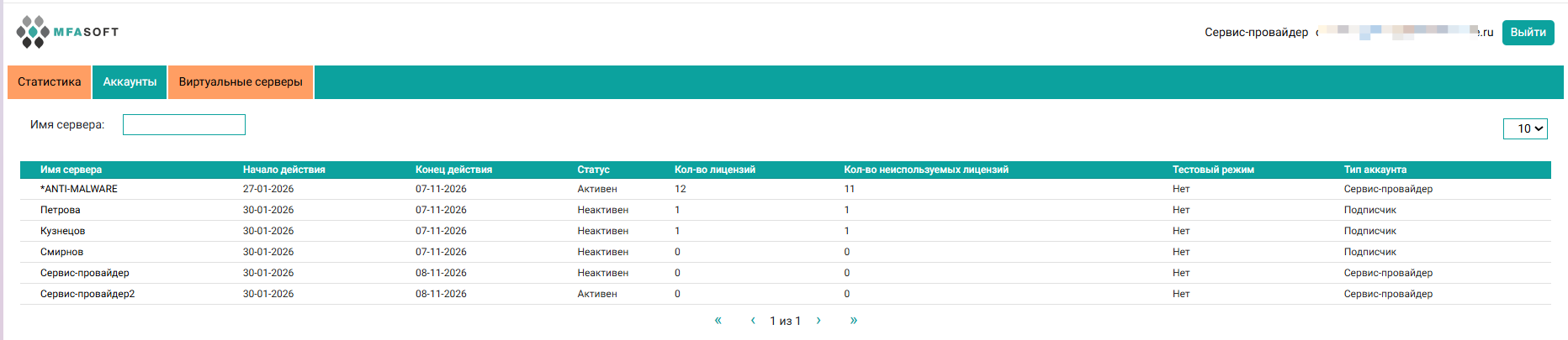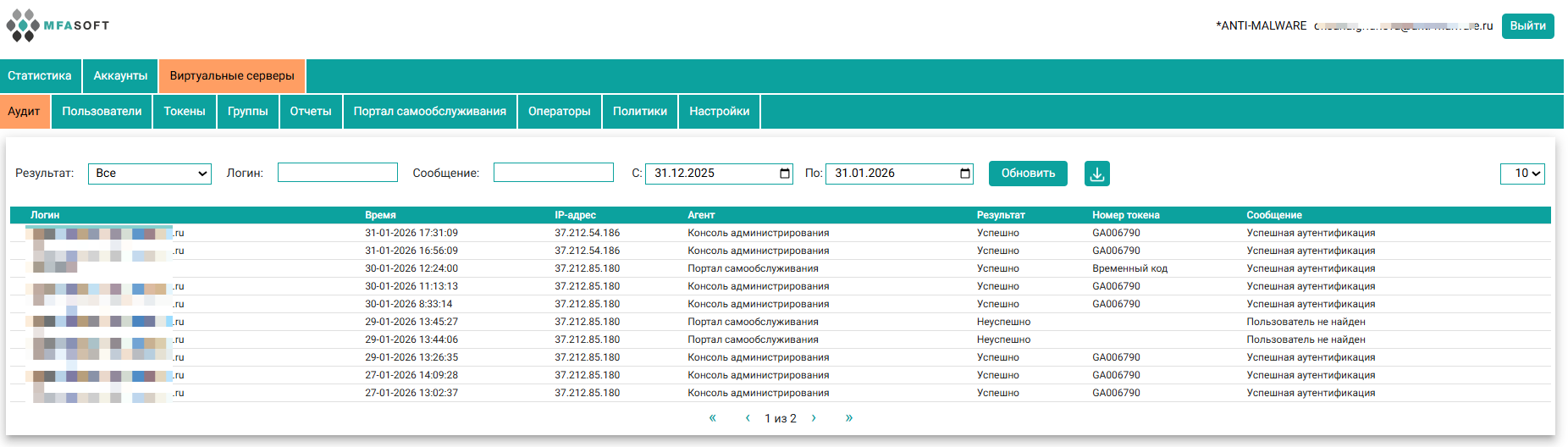 Аудит. Для каждого виртуального сервера система ведёт отдельный журнал событий аутентификации (входа), который хранится в базе данных и отображается в консоли.