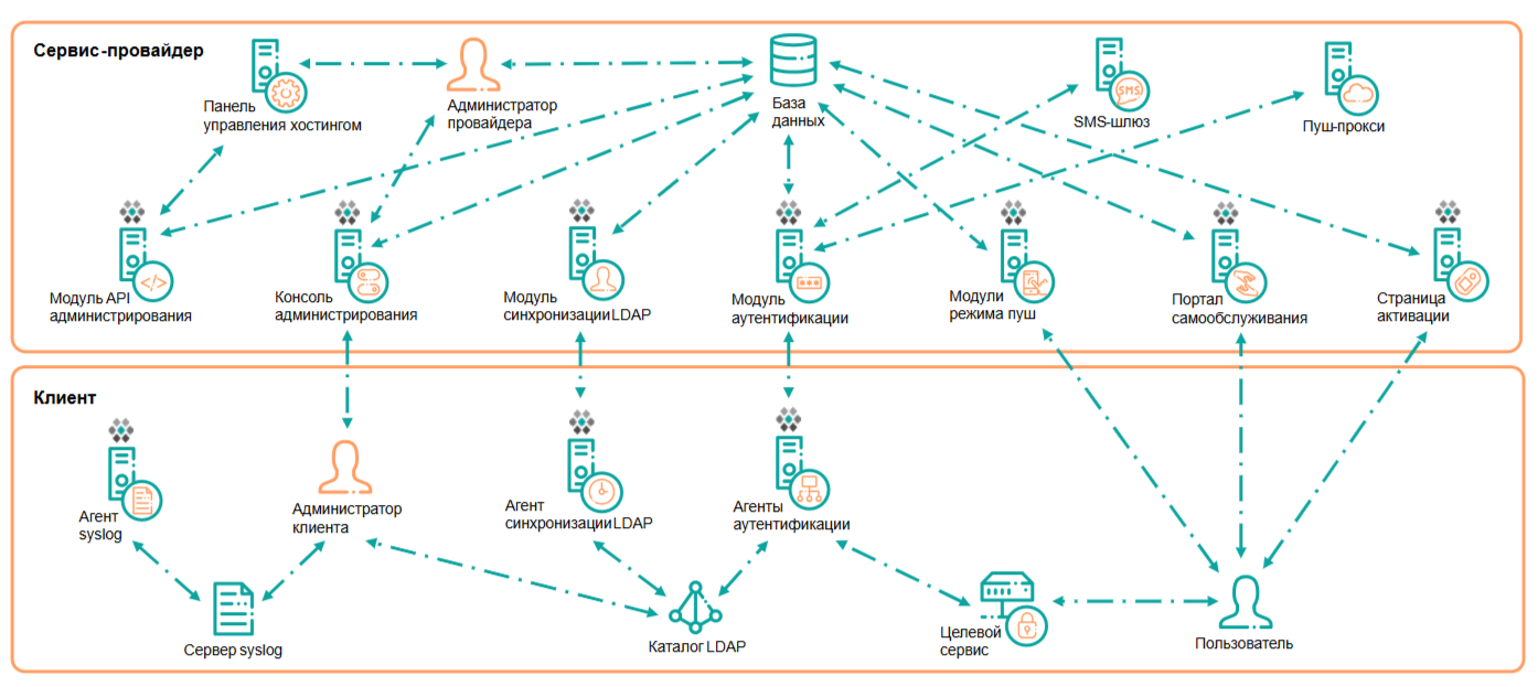 - программные агенты, при помощи которых обеспечивается связь с защищаемыми информационными ресурсами, внешними каталогами учётных записей и системами регистрации событий;