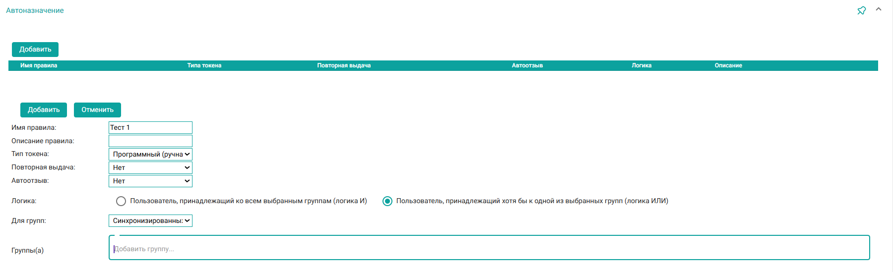 Функция автоназначения автоматизирует выдачу и отзыв аутентификаторов, а также назначение административных ролей пользователям.