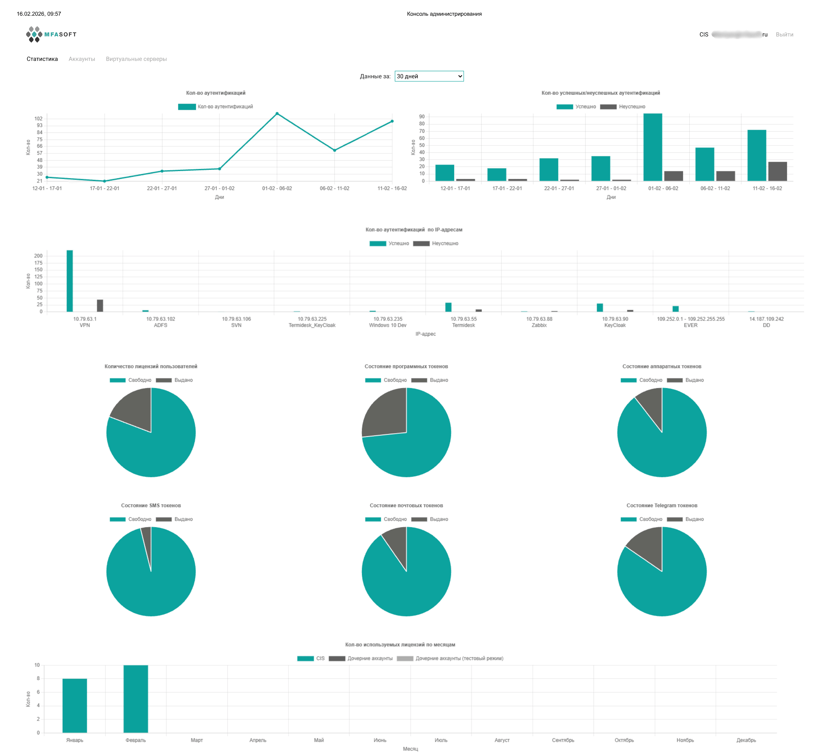 В консоль администрирования встроен дашборд, отображающий статистику по аутентификациям и токенам за выбранный период в разных разрезах (по датам, по результату, по IP-адресам). Продукт поддерживает однократное или регулярное создание сводных отчётов по кастомизированным шаблонам, сохранение их в файлах и отправку по электронной почте.