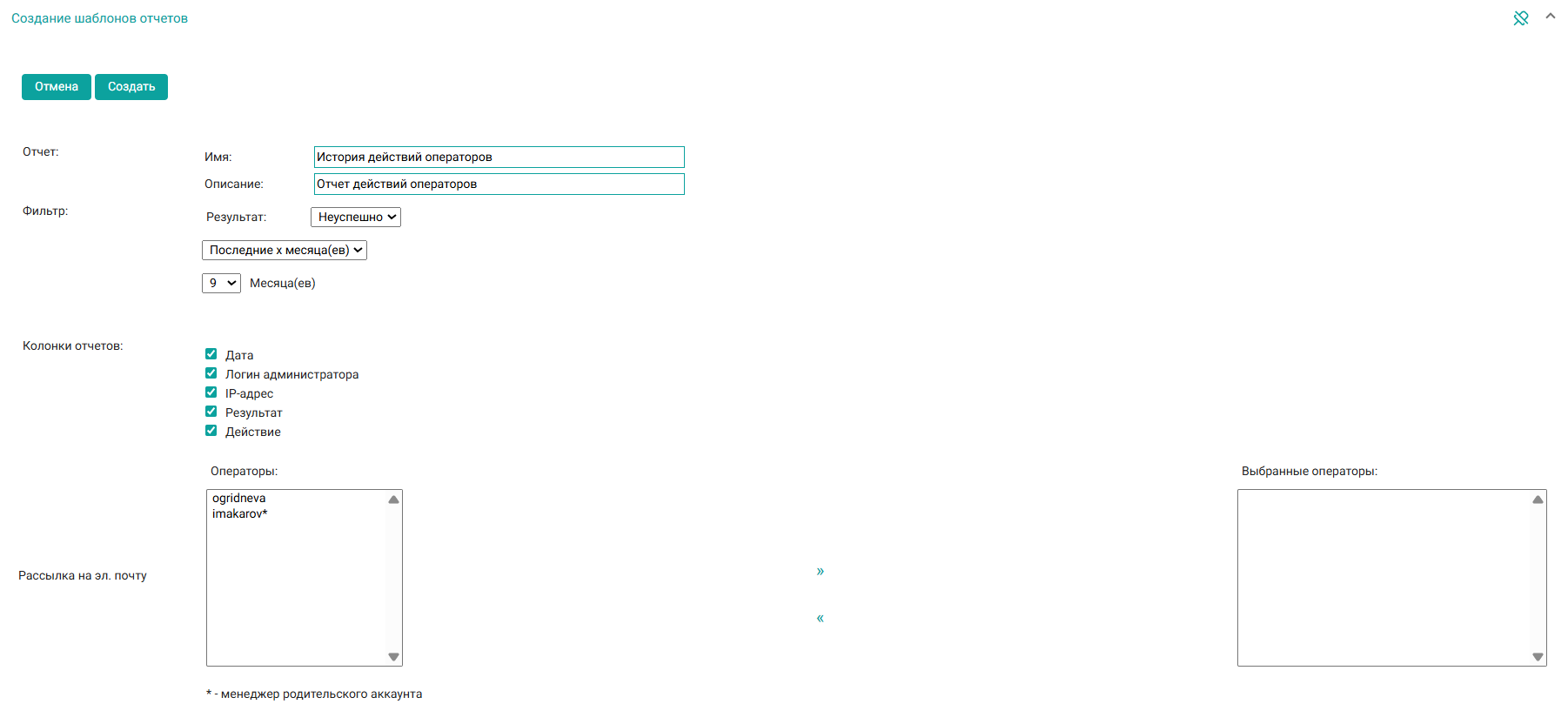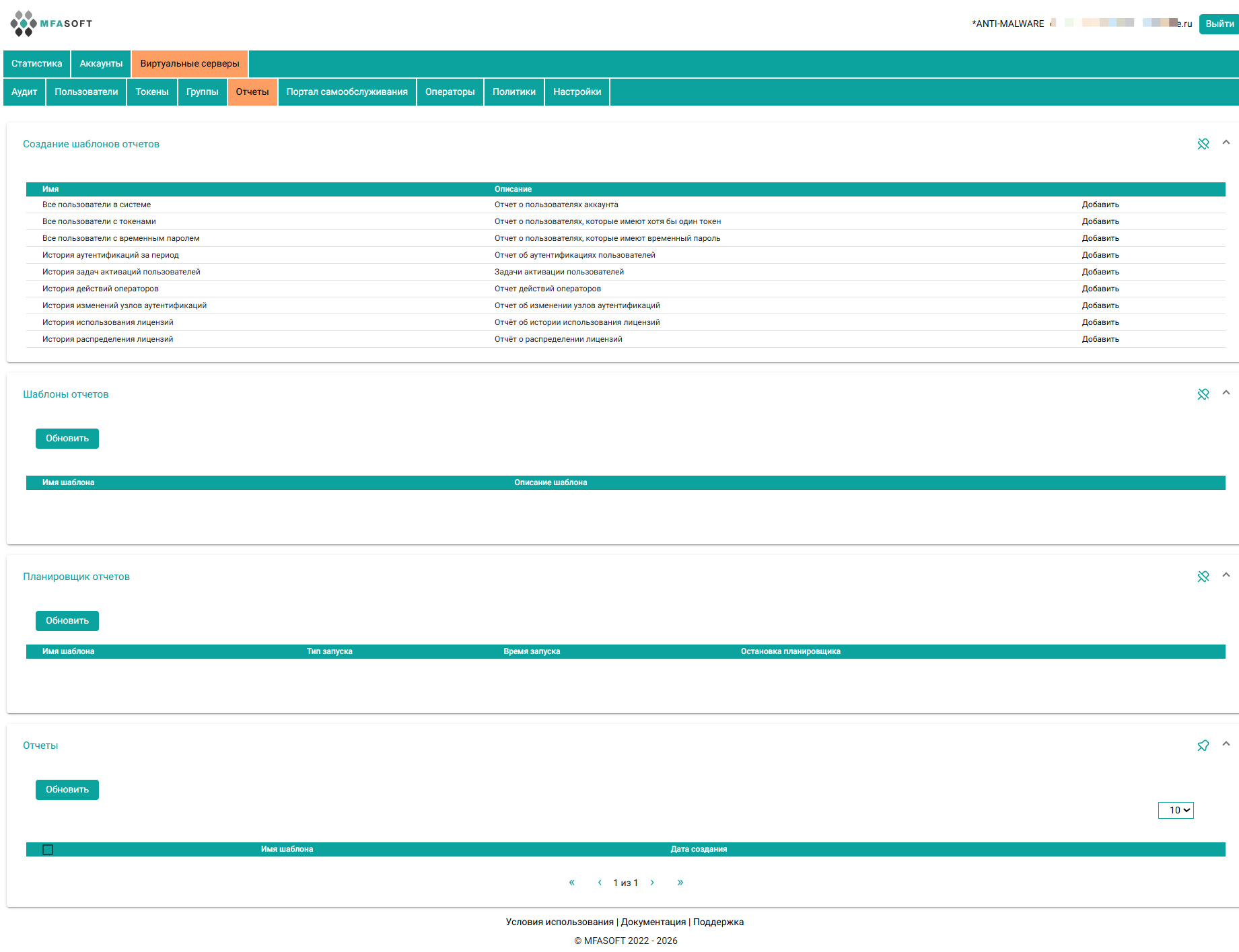 Отчёты. Отчёты о количестве, распределении и статусе пользователей, токенов и лицензий, о действиях операторов, о создании задач и узлов активации и др. можно сохранять на сервере или отправлять по электронной почте. Отчёты выгружаются по настроенным оператором шаблонам.