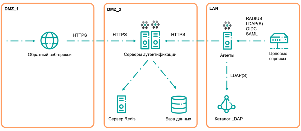 При использовании внешней СУБД или недостаточной производительности машин необходимо серверы баз данных разместить в отдельном кластере. Если в организации используется межсетевой экран, который блокирует весь исходящий трафик из публичной сети (WAN) или демилитаризованной зоны (DMZ) во внутренний сегмент (LAN), пользователи решения не смогут получать пуш-уведомления. Они не смогут входить на портал самообслуживания и активировать аутентификаторы из-за периметра корпоративной сети. Администраторы при этом не смогут использовать консоль администрирования без подключения к VPN.
