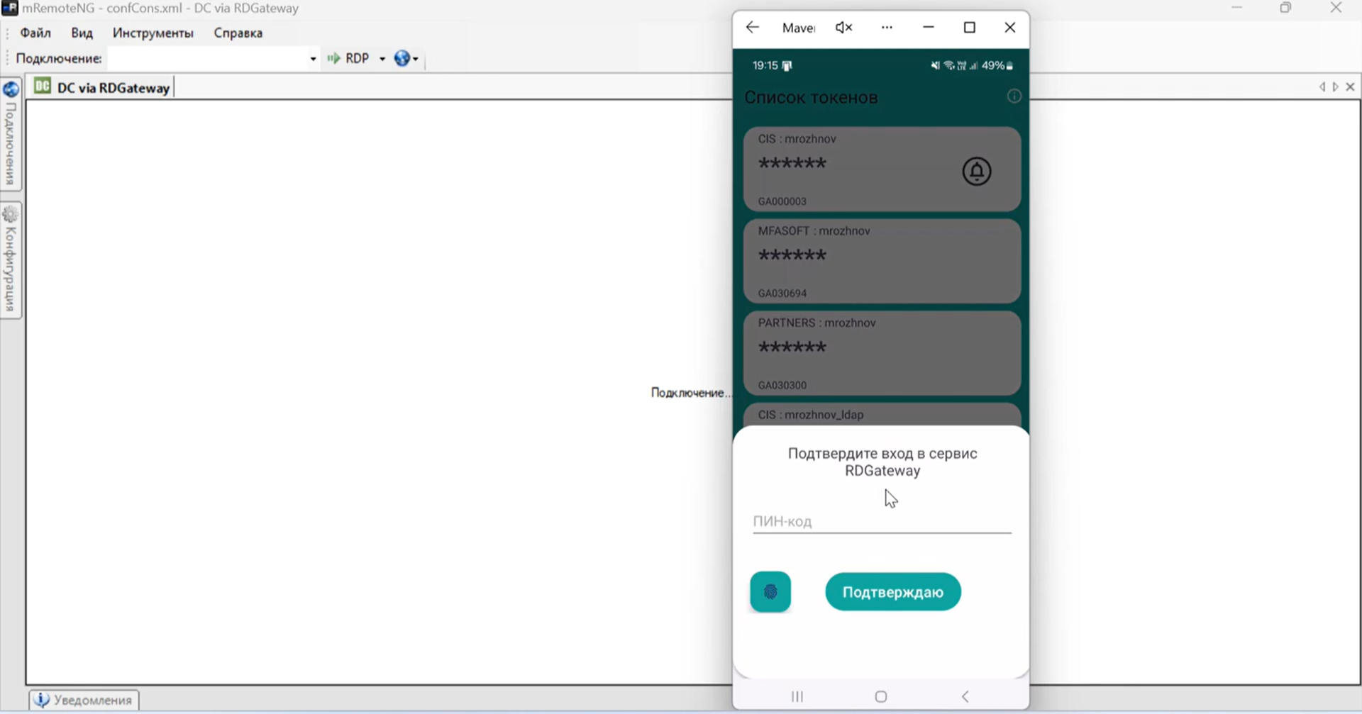 Так как при подключении к RD Gateway нет поля, куда можно было бы ввести OTP, на базе SAS в этом случае можно реализовать двухэтапную аутентификацию с использованием аутентификаторов в режиме пуш: мобильного приложения MFASOFT или Telegram. На рисунке ниже показали, как используется для аутентификации мобильное приложение в режиме пуш.