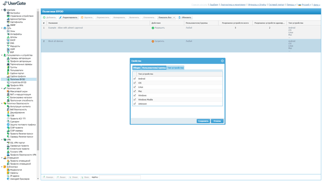 Рисунок 31. Свойства правила концепции BYOD на UserGate, разрешающего подключение устройств определенного типа
