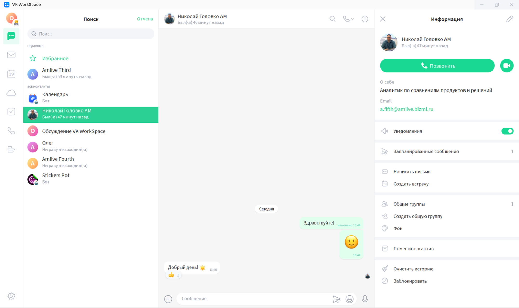 Из мессенджера можно сразу отправить письмо всем коллегам в почту, назначить встречу, создать опрос в чате или сформировать задачу. Реализованы функции очистки истории переписки, её перемещения в архив, блокировки пользователя.