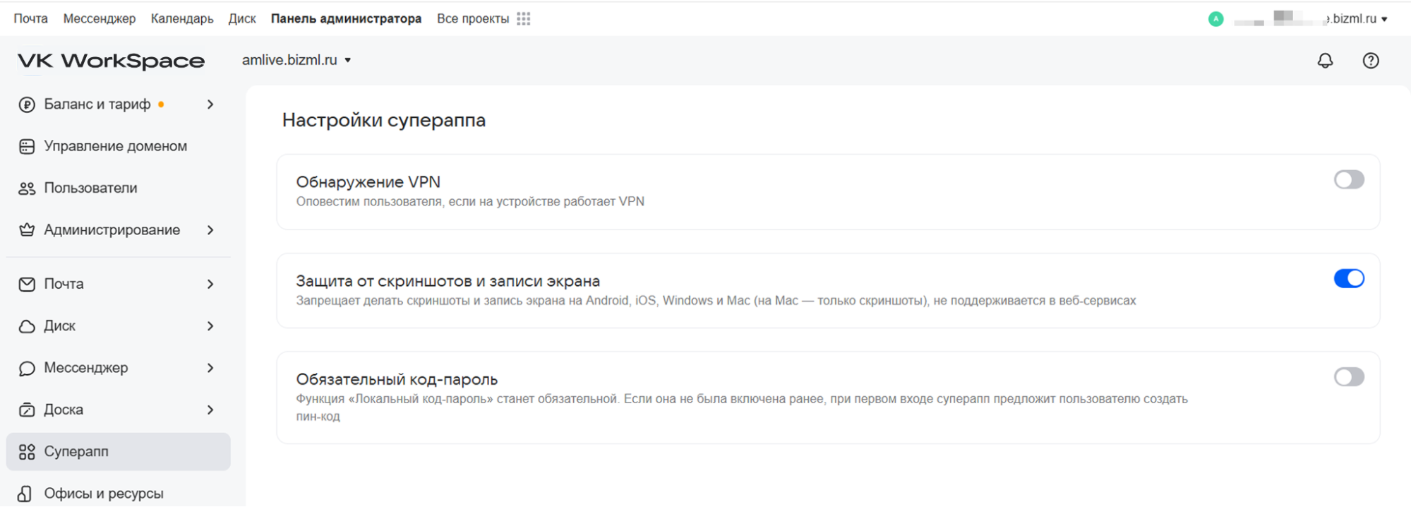 В VK WorkSpace также реализованы инструменты администрирования для управления доступом пользователей и настройки сервисов под потребности компании.