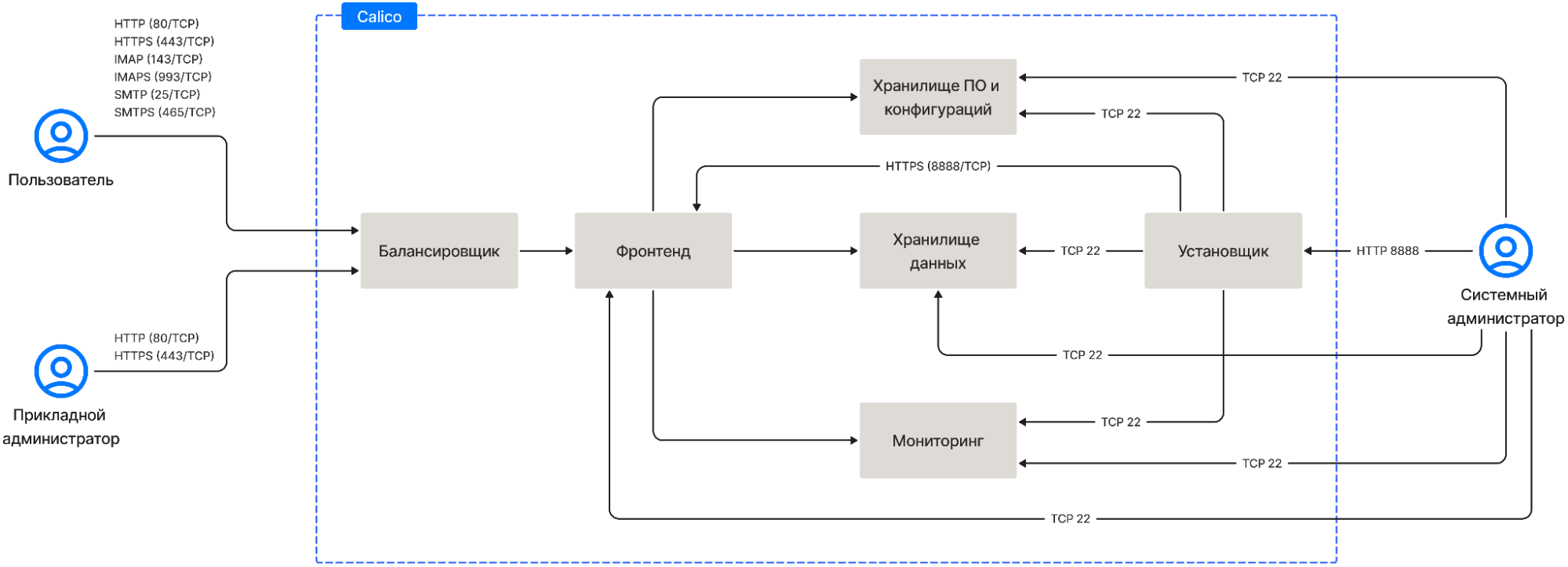 • Calico. Отвечает за сетевое взаимодействие между контейнерами системы, расположенными на разных серверах.